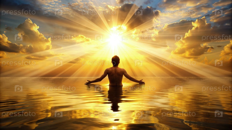 Человек стоит в золотом свете заходящего солнца над водой