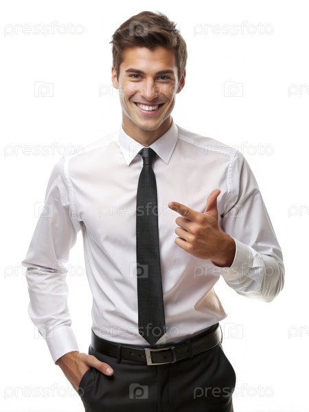 Улыбающийся молодой бизнесмен, одетый в белую рубашку и черный галстук на белом фоне