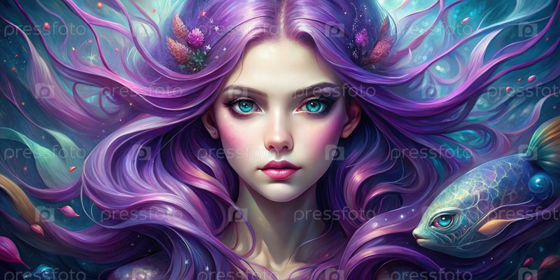 Русалка с фиолетовыми волосами и космическими глазами под морем
