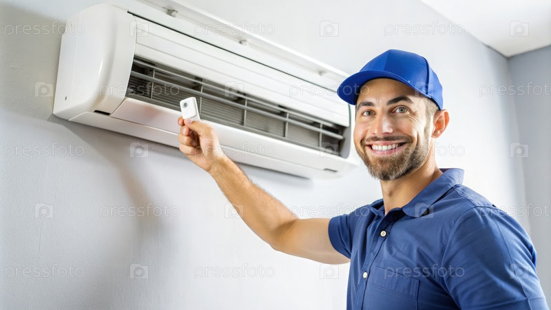 Счастливый техник кондиционера, регулирующий термостат. генеративный AI