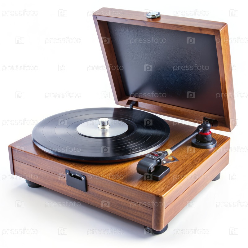 Винтажный деревянный проигрыватель с открытой крышкой на белом фоне