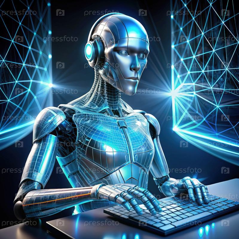 Робот с прозрачной головой, работающий на компьютере. генеративный продвинутый ИИ