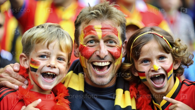Веселые бельгийские футбольные фанаты, окрашенные в национальные цвета