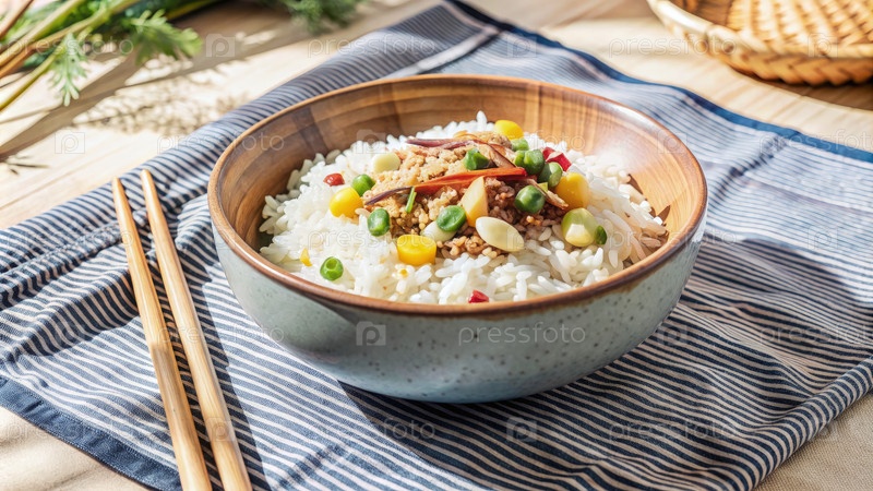 Деревянная миска риса с мясом и овощами, подаваемыми на полосатой салфетке