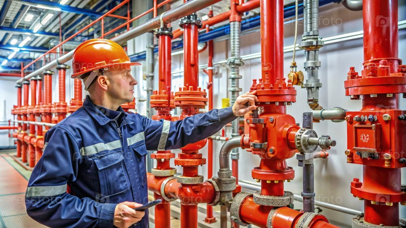 Спасатель из МЧС России проверяет систему пожаротушения на промышленном объекте