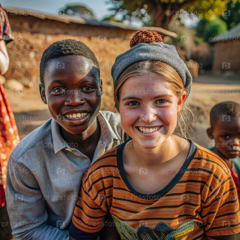 Молодой американский волонтер улыбается замбийским детям в деревне