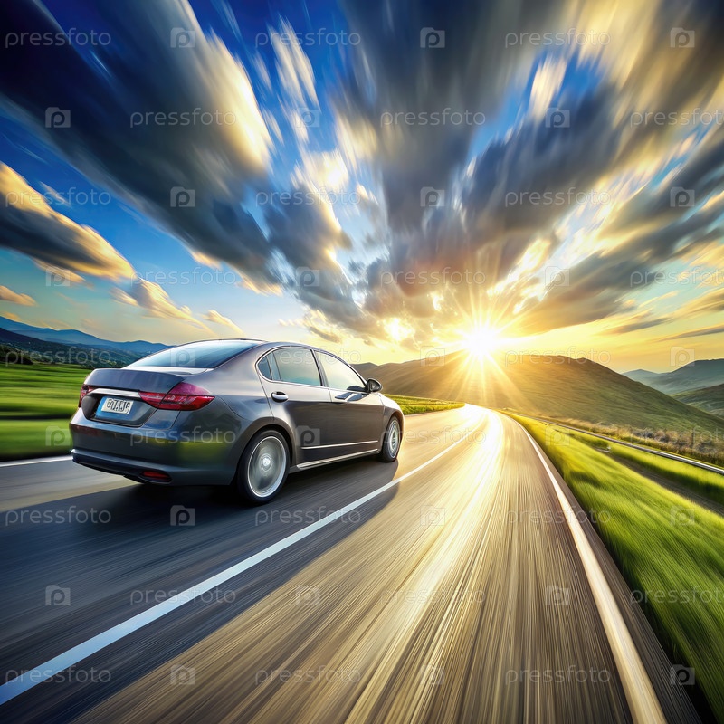 Автомобиль, едущий на высокой скорости по извилистой дороге во время захода солнца