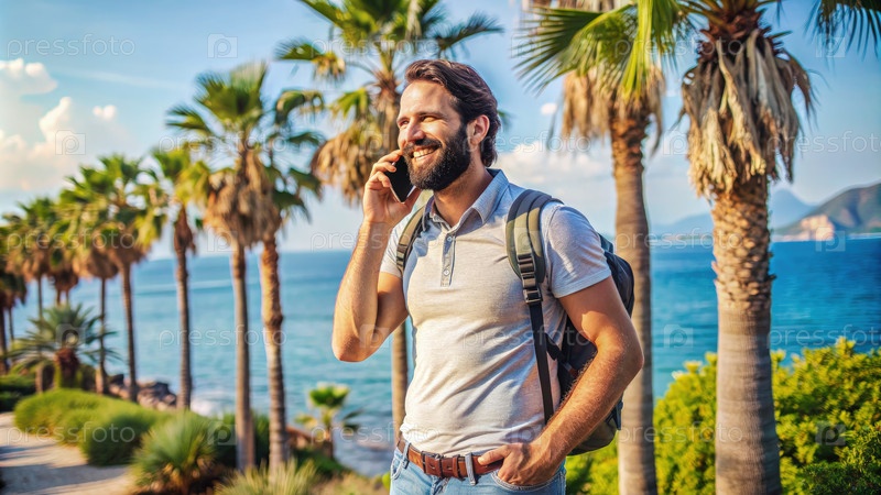 Счастливый путешественник делает телефонный звонок в Анталии, Турция