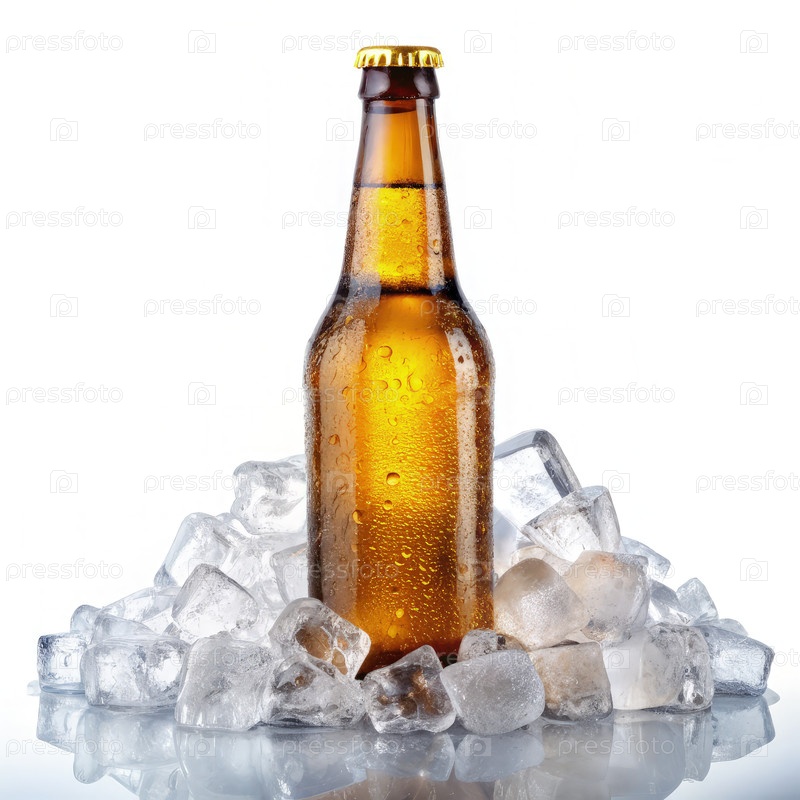 Бутылка холодного пива, окруженная кубиками льда на белом фоне