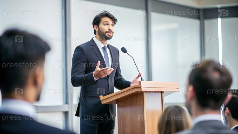 Бизнесмен выступает с речью на конференции в современной офисной обстановке