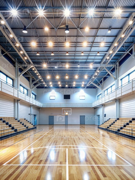 Пустой спортивный зал в помещении с баскетбольной площадкой и трибунами