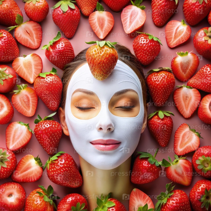 Женщина отдыхает со клубничной маской для лица и свежими ягодами