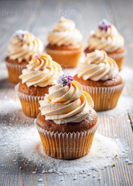 Вкусные ванильные кексы, опрыскиваемые сахаром в порошке на деревянном столе