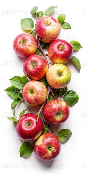 Свежие красные яблоки, висящие на ветке на белом фоне