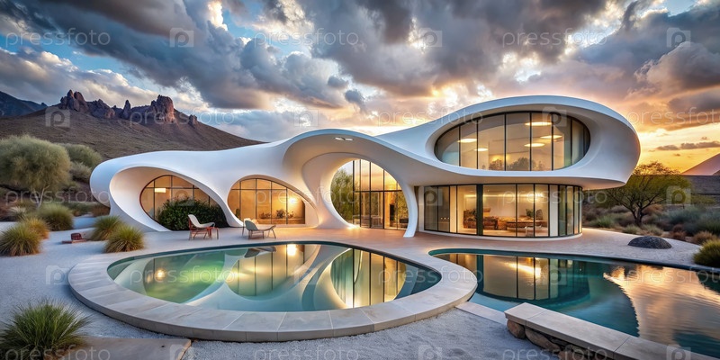Белый дом с бассейном и пейзаж пустыни на закате