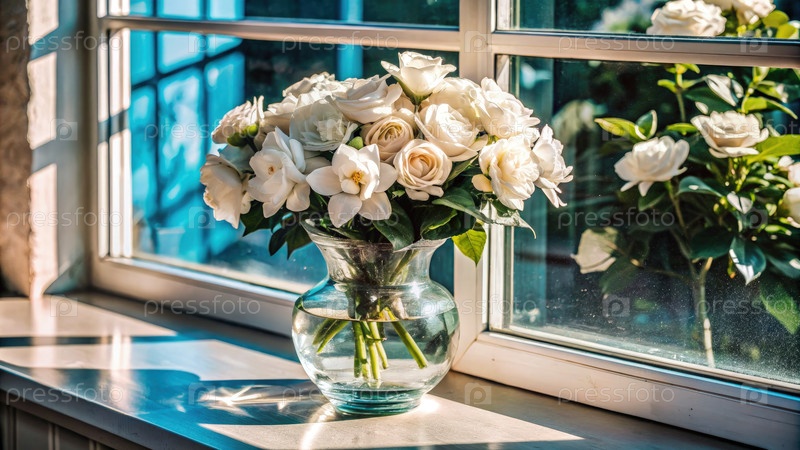 Букет белой гардении на подоконнике под солнечным светом