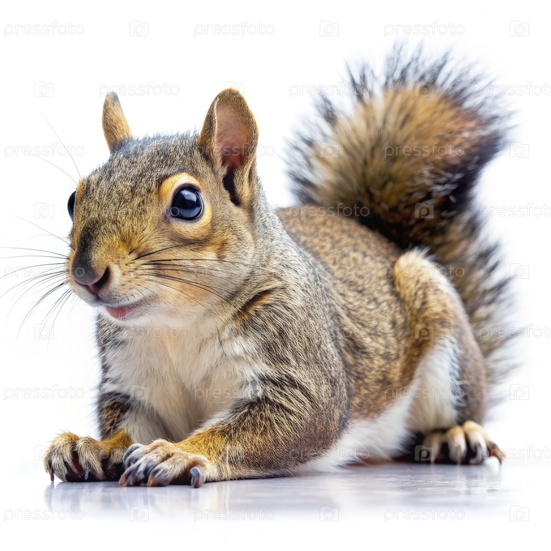 Профильный вид серой белки, лежащей на белом фоне