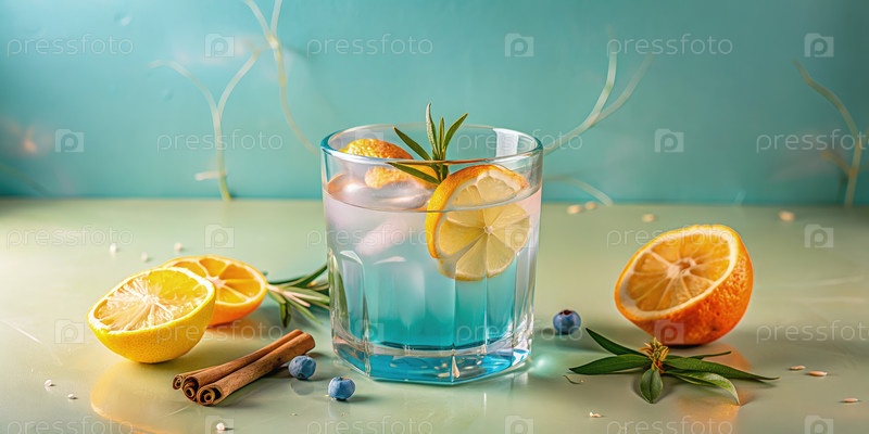 Коктейль из голубого джина с лимонным, оранжевым и розмариновым украшением на столе