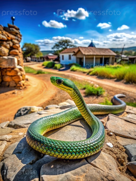 Бумсланг Змея, свернутая на камнях возле сельской деревни в Южной Африке