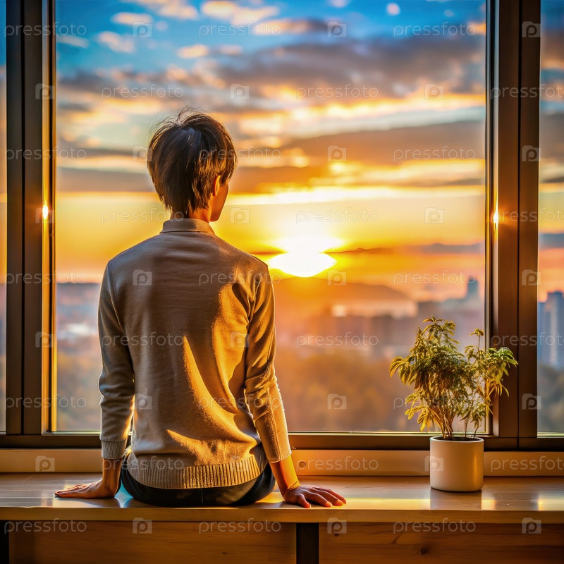 Человек, наблюдающий за закатом солнца из окна