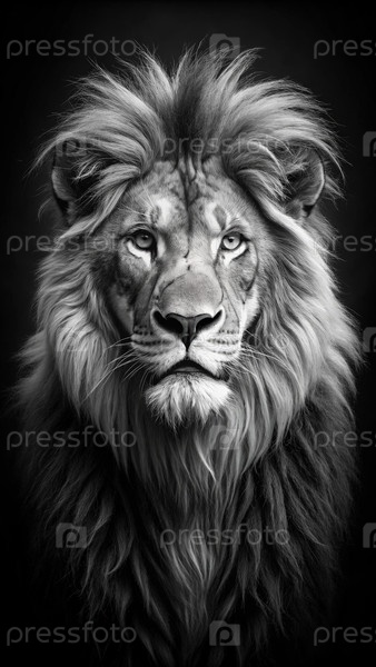 Величественный черно-белый портрет льва на темном фоне