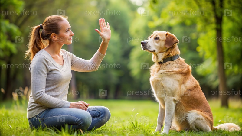 Женщина тренирует собаку с помощью ручного сигнала в зеленом парке