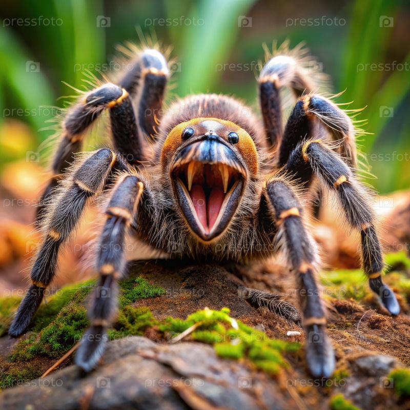Калифорнийская тарантула с открытым ртом на лесном полу