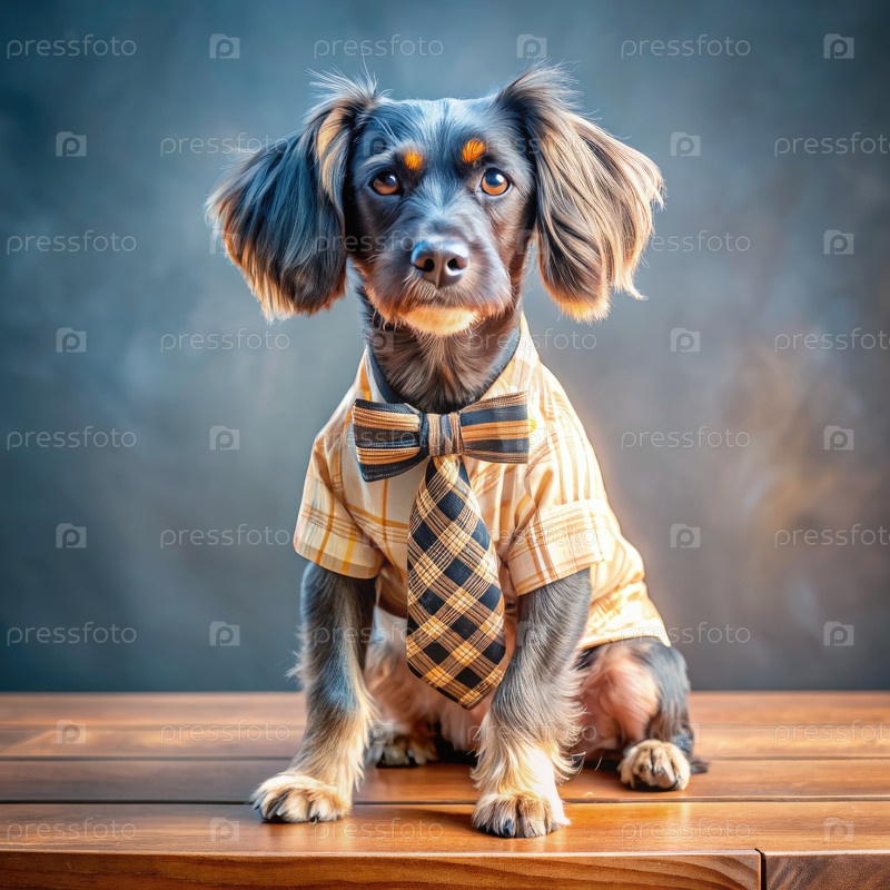 Черная собака, одетая в желтую платовую рубашку и галстук, позирует на деревянной поверхности