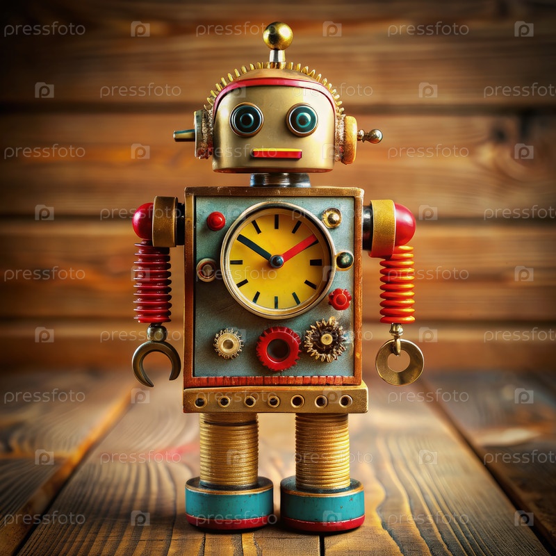 Vintage Robot Toy Timer на деревянной поверхности. генеративный ИИ