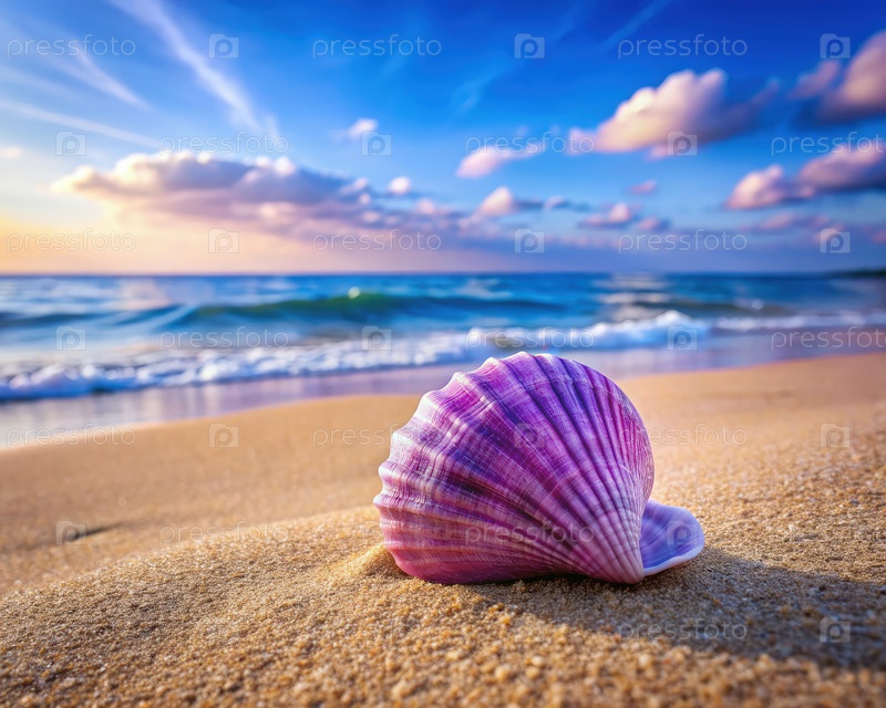 Лиловая раковина на песчаном пляже при закате солнца