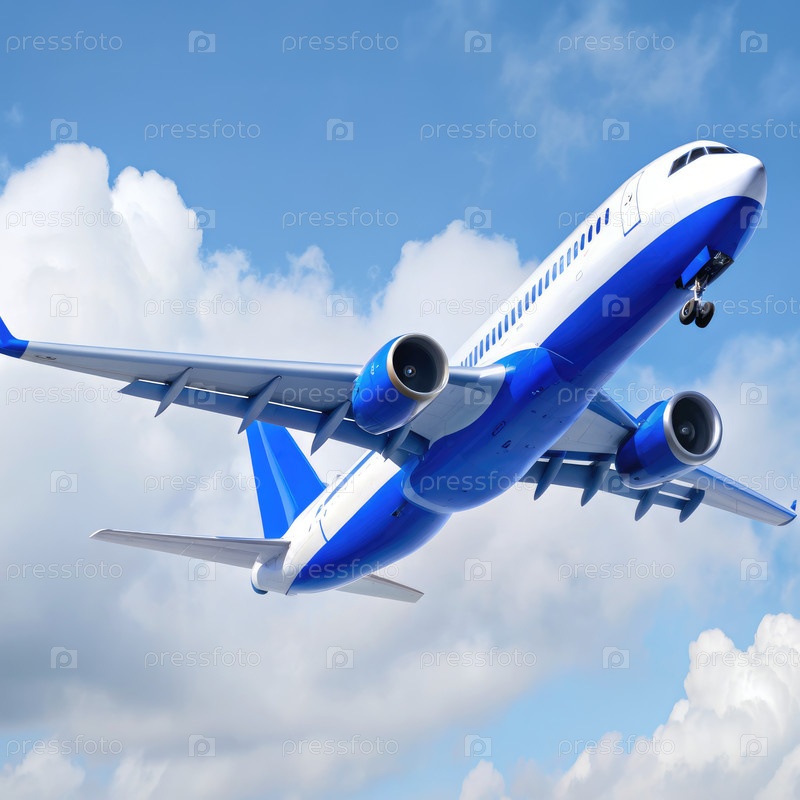 Синий и белый самолет, поднимающийся сквозь облака в солнечный день
