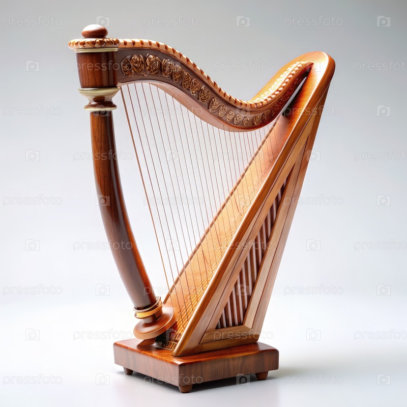 Украшенная деревянная арфа наклонена назад на сером фоне