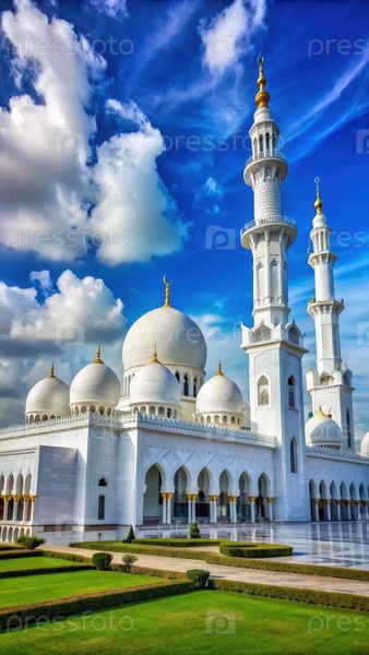 Белая мечеть с золотыми куполами на ярко-синем небе в Абу-Даби, Объединенные Арабские Эмираты