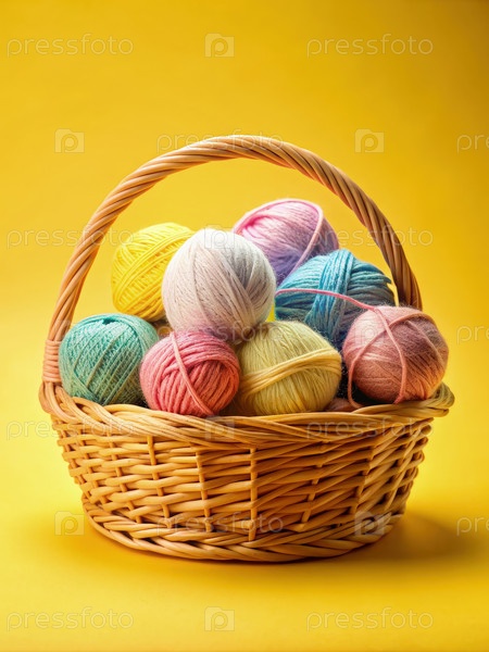 Пастельные шарики из пряжи в корзине с укропом на желтом фоне