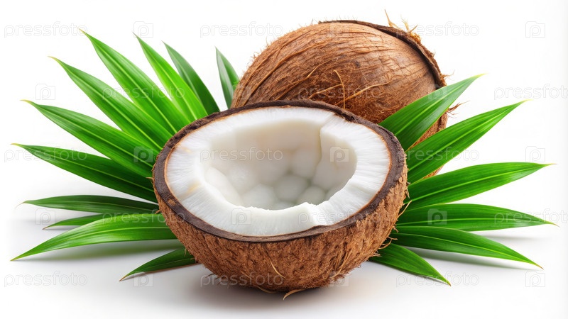 Свежий кокосовый орех с пальмовыми листьями на белом фоне