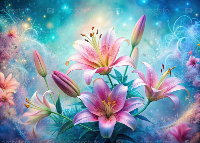 Абстрактные розовые лилии с бутонами в причудливой синей обстановке