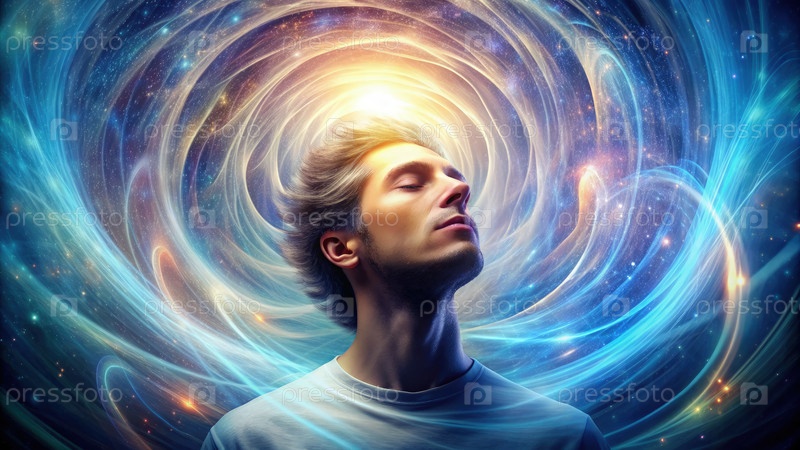 Человек с закрытыми глазами, окруженный спиральным светом и звездами
