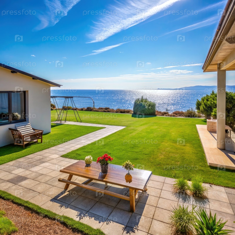 Пустой двор с крыльцовым столом в семейном доме недалеко от моря
