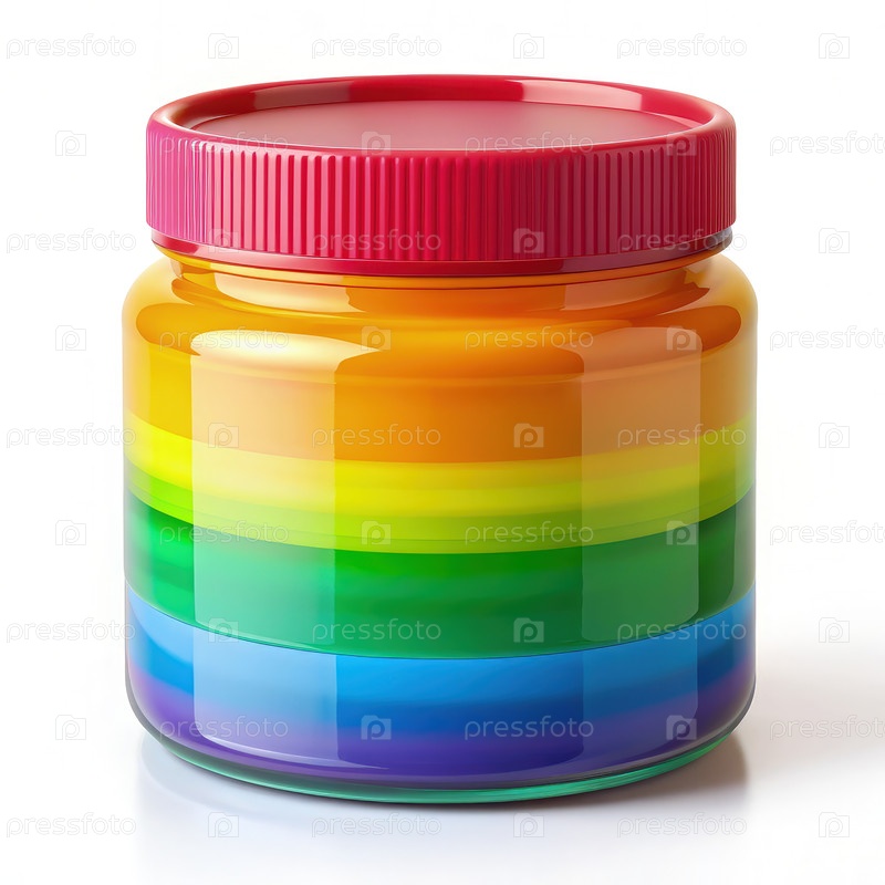 Радужная пластиковая банка с красной колпачкой на белом фоне