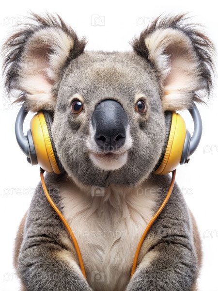 Коала с желтыми наушниками слушает музыку