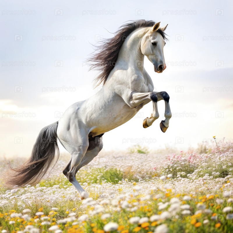 Андалузская лошадь, воспитывающаяся на поле диких цветов