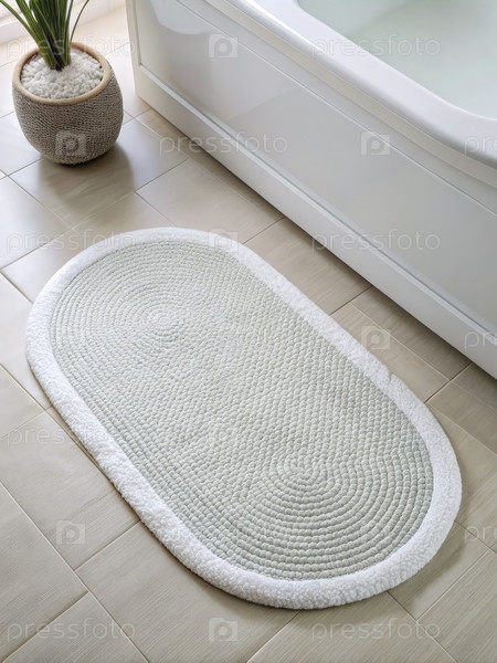 Маленький, овальный абсорбирующий коврик для ванны лежит рядом с белой ванной в современной ванной комнате