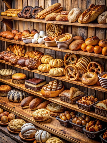 Массив свежевыпеченных хлебов и кондитерских изделий, выставленных на деревянных полках в пекарне
