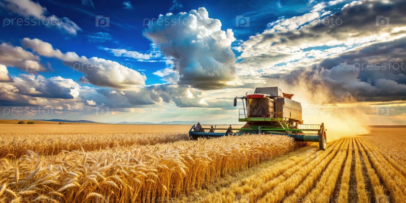 Комбинационный сборщик работает на пшеничном поле под голубым небом