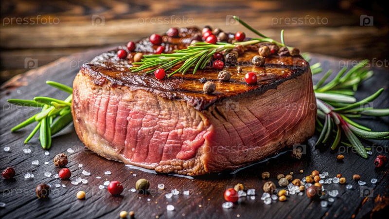Закрытие редкого стейка из филе с розмарином и перцем на деревянной доске