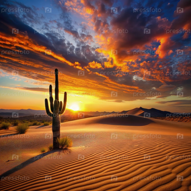 Одинокий силуэт сагуаро против огненного захода солнца в пустыне. генератив AI