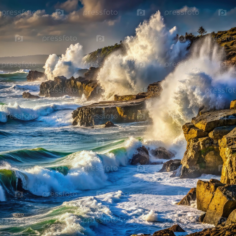 Мощные волны, врезающиеся в скалистую береговую линию на закате