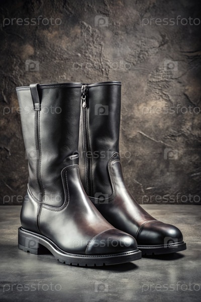 Черные кожаные верховые сапоги с детализированным резьбой на грубом текстурированном фоне