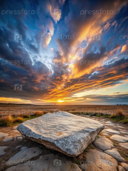 Большой плоский камень под драматическим закатом солнца на болотах Северного Йорка