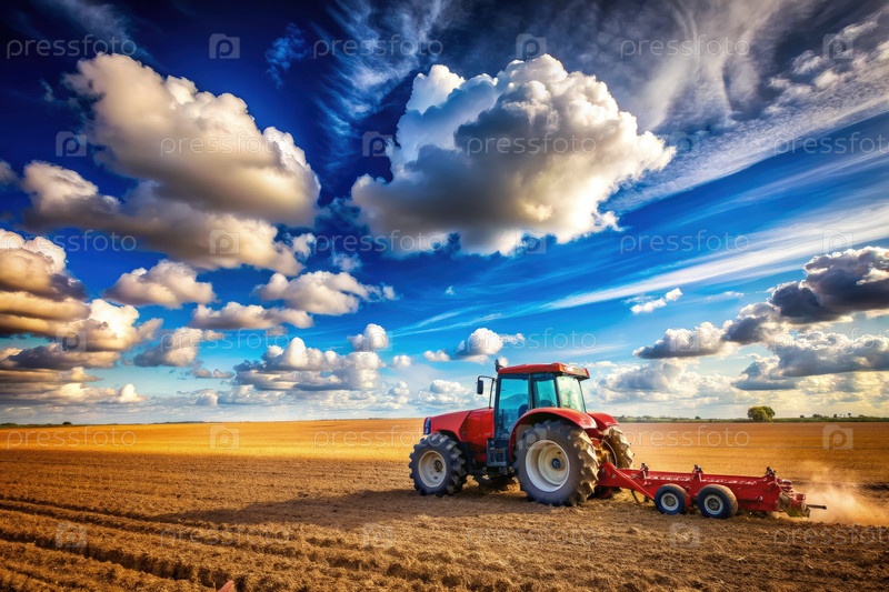 Красный трактор, возделывающий огромное поле под облачным небом